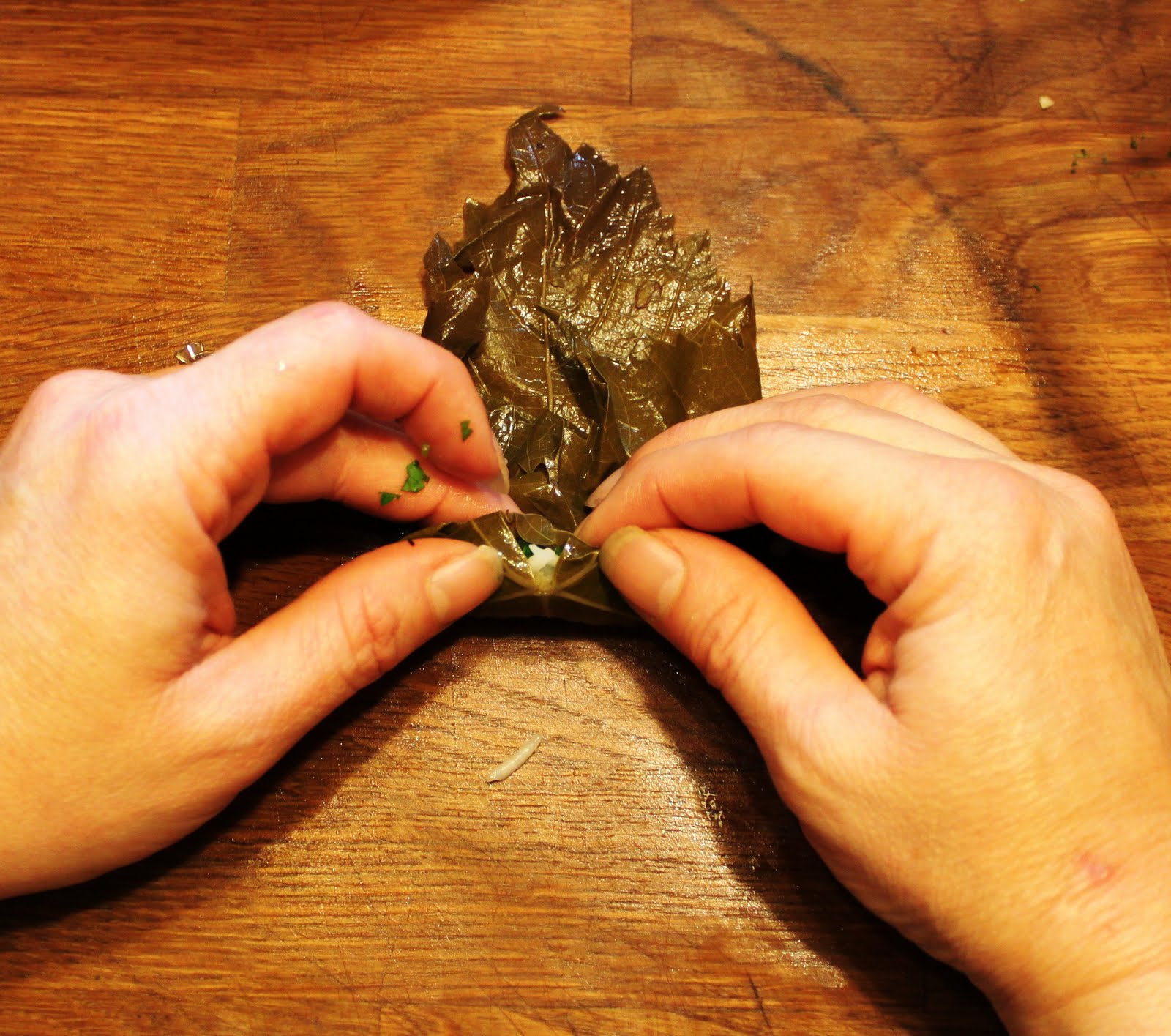 Place 2-3 teaspoons of filling in the middle. The amount depends on how big the leaf is. You'll get a feeling for it as you roll-along.